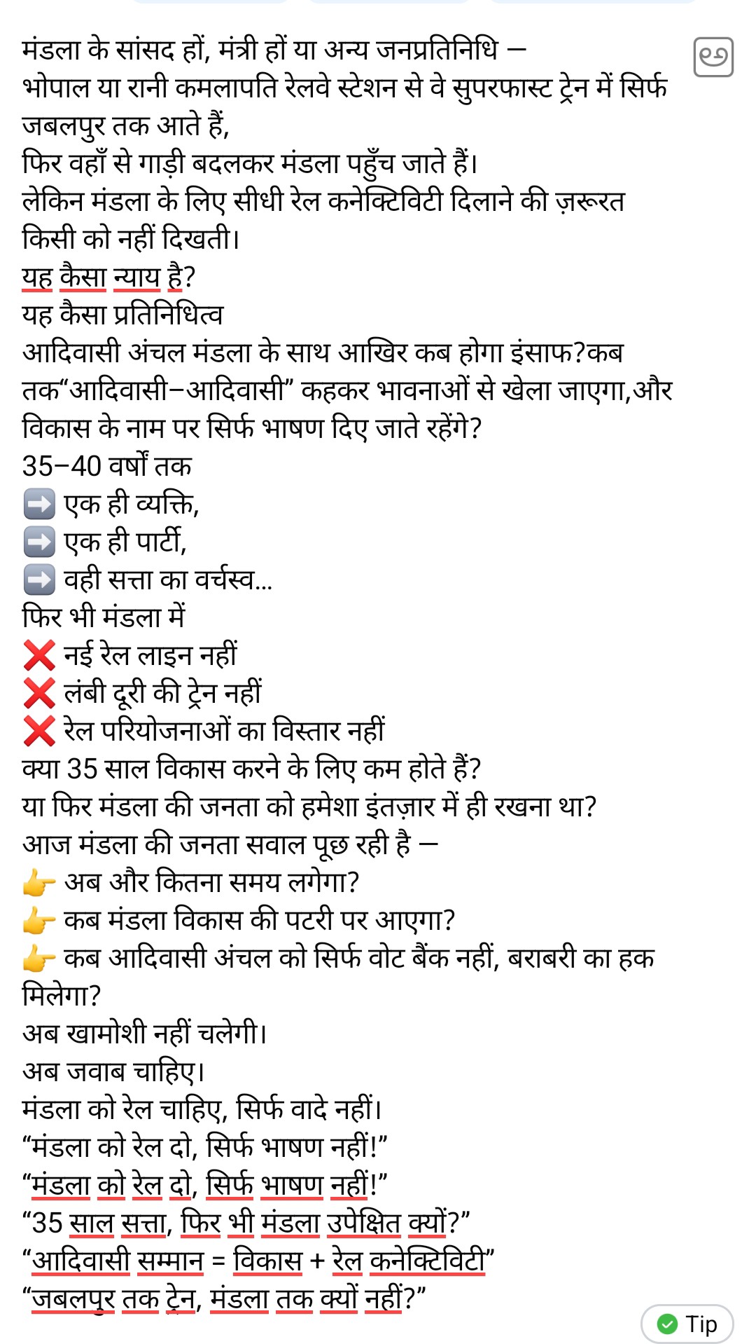 फिर वहाँ से गाड़ी बदलकर मंडला पहुँच जाते हैं।लेकिन मंडला के लिए सीधी रेल कनेक्टिविटी दिलाने की ज़रूरत किसी को नहीं दिखती यह कैसा न्याय है?यह कैसा प्रतिनिधित्व आदिवासी अंचल मंडला के साथ आखिर कब होगा इंसाफ?कब तक“आदिवासी–आदिवासी” कहकर भावनाओं से खेला जाएगा,और विकास के नाम पर सिर्फ भाषण दिए जाते रहेंगे?