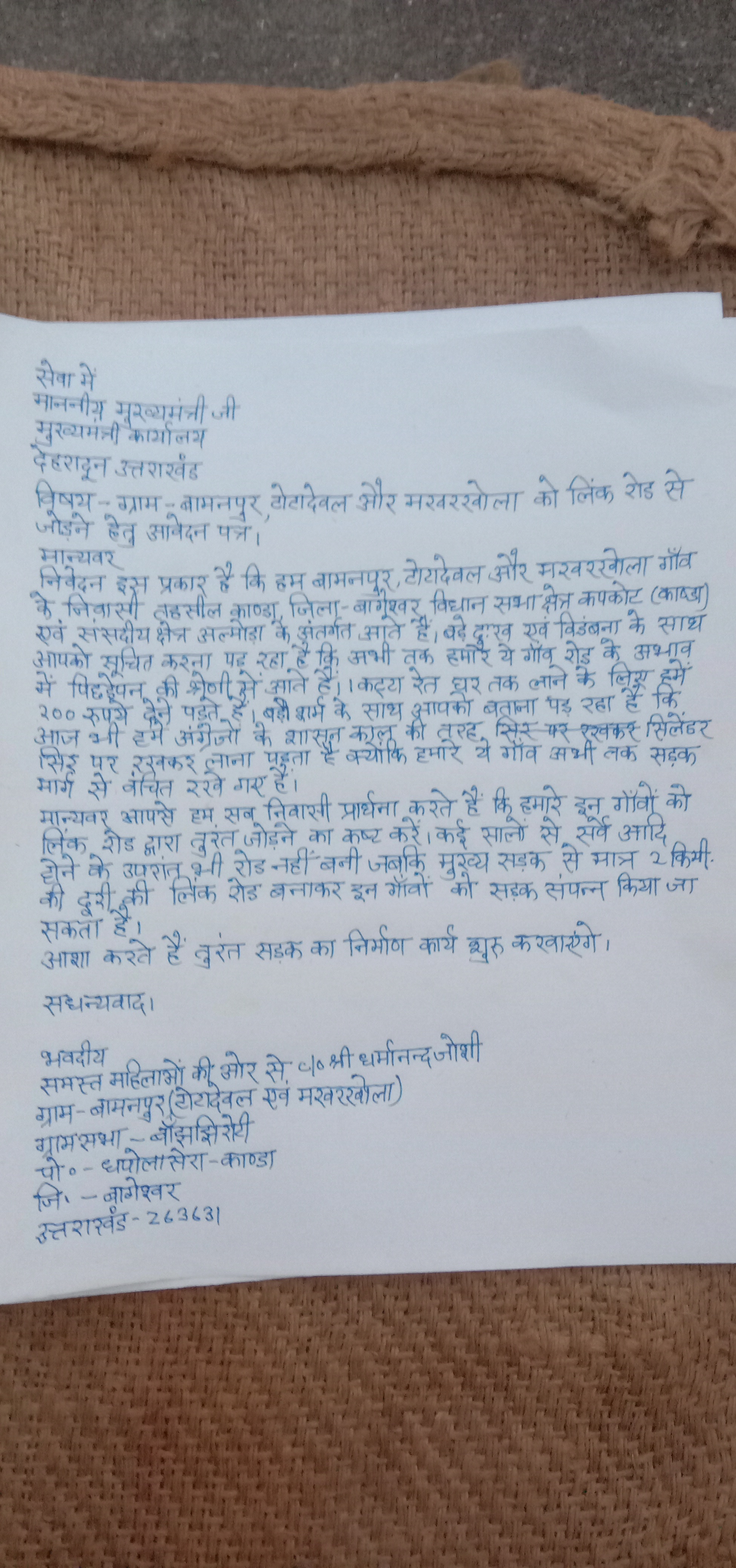 मान्यवर हम ग्राम - बामनपुर ,पोस्ट धपोलासेरा(कांडा) ज़िला-बागेश्वर उत्तराखंड पिन-263631के निवासी आज तक भी सड़क न होने के कारण अभिशाप का जीवन जी रहे हैं।ऐसे हालात में पर्यटन का क्या होगा। हमारी ग्राम सभा के 3 छोटे से गांव छोटे होने के कारण यहां सड़क अभी तक नहीं पहुंची। आज भी बीमार तथा गर्भवती महिलाओं को डोली में बिठाकर ले जाना पड़ता है। महिलाएं सिर पर cylender भरकर लाती हैं। प्रारम्भिक स्तर पर सभी को लिखा जा चुका है पर सब सालों से टाल- मटोल करते हैं कोई सुनता नहीं कृपया संज्ञान लें।।