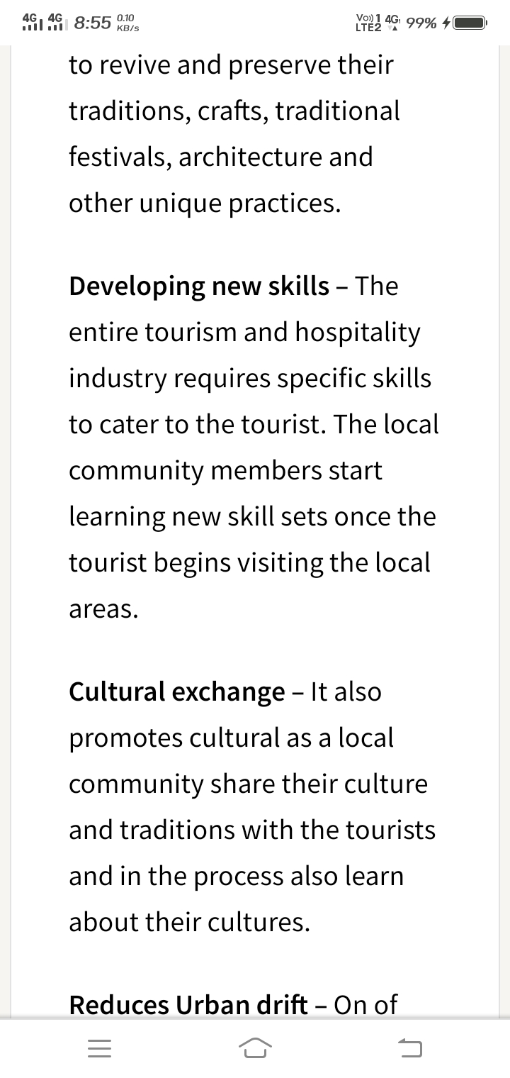 Preservation of local tradition – As tourist visit rural areas to feel authentic rural settings, the tourism provides economic incentives to preserve cultures and traditions.