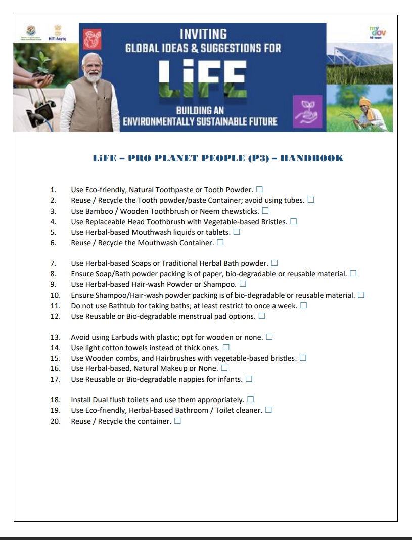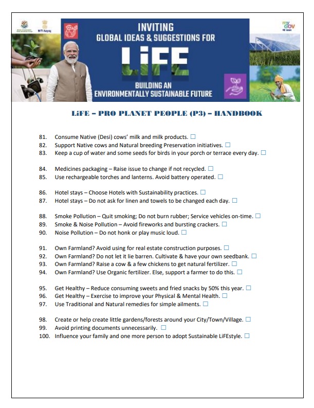 Based on our experience/knowledge, I have compiled a Checklist of 100 changes that individuals can make to their LiFEstyle & reduce the carbon footprint. Changes include,