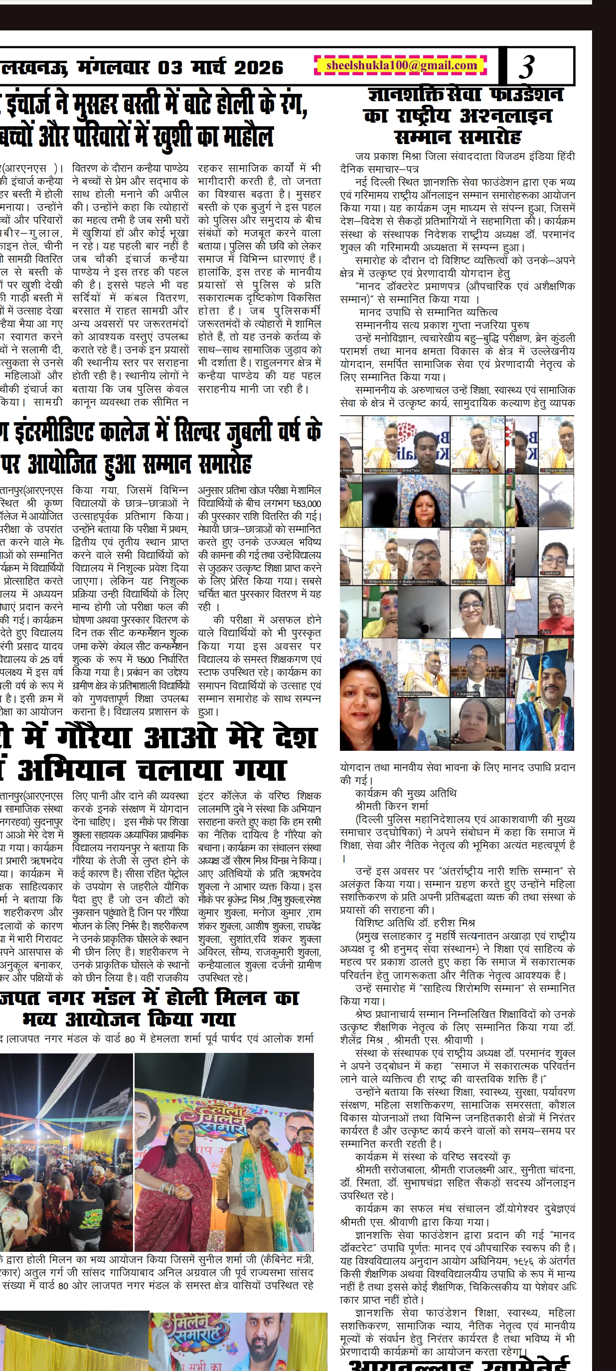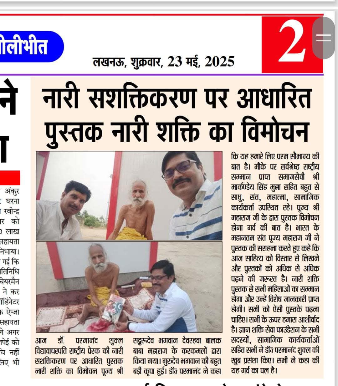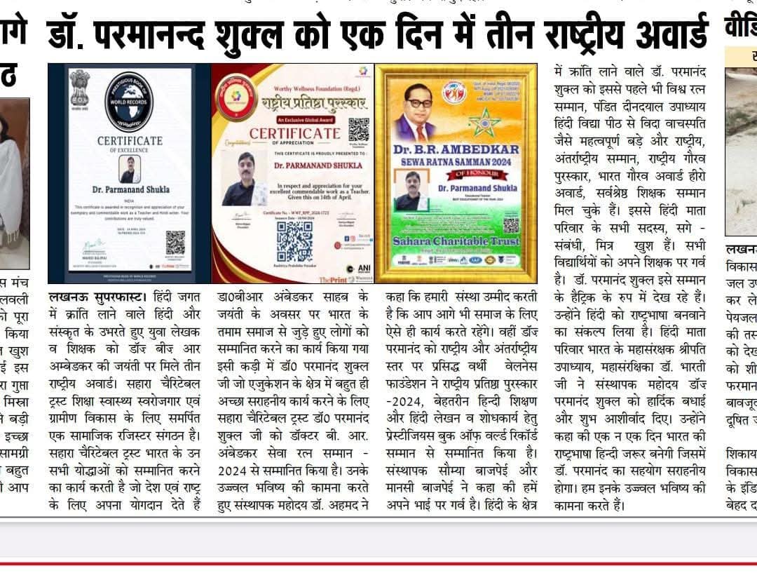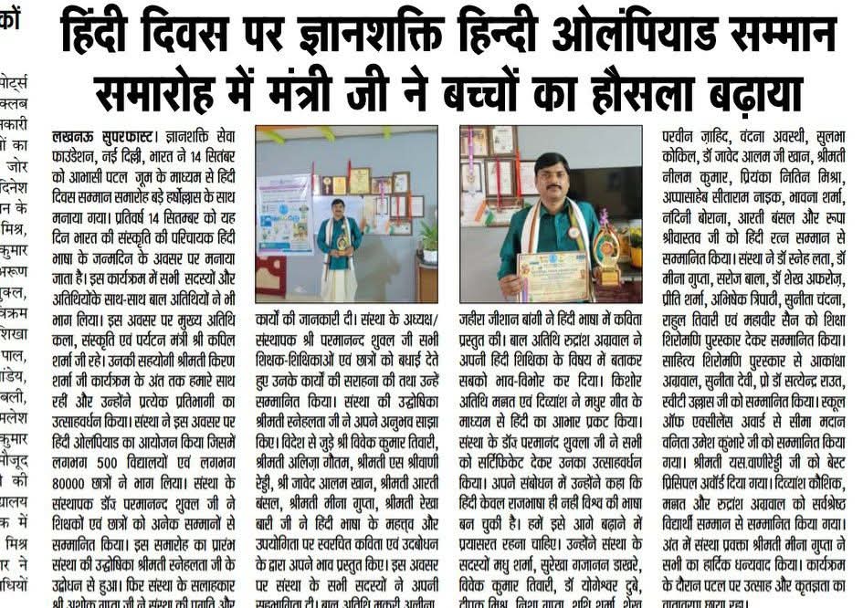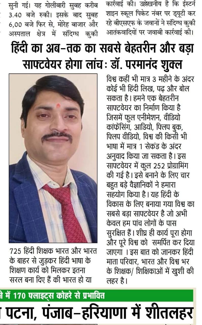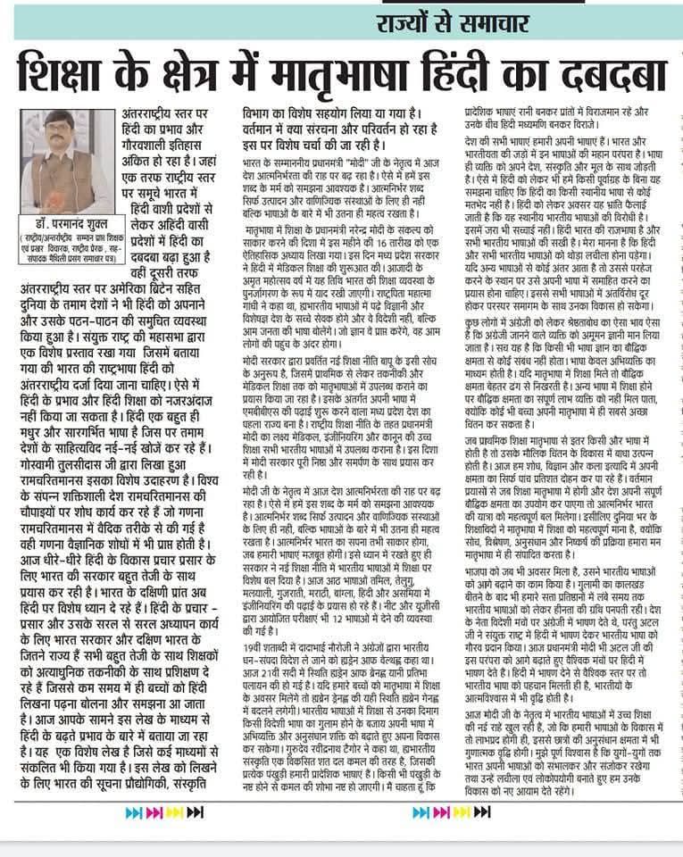 सम्माननीय प्रधानमंत्री जी सादर प्रणाम। मैं डॉ• परमानन्द शुक्ल हिन्दी शिक्षक आन्ध्रप्रदेश से हूँ। आपके द्वारा चलाए जा रहे अभियान प्रेरणादायी हैं। आपके द्वारा विगत दिनों परीक्षा पे चर्चा में भाग लिया और सम्मान पत्र प्राप्त किया हमें बहुत खुशी हुई। हम सदैव आपके द्वारा प्रसारित मन की बात को सुनते हैं। हमें आप पर गर्व है। हमने भारत का सबसे बड़ा मोटीवैशनल हिन्दी साफ्टवेयर तैयार किया है। हिन्दी के विकास में हम सदैव कार्यरत हैं, इस उद्देश्य से हमने ज्ञानशक्ति सेवा फाउंडेशन की शुरुआत राष्ट्रीय स्तर पर किया जो एमसीए से रजिस्टर्ड है। महोदय हमारी दिली इच्छा है की एक बार आप हमें मन की बात में जरुर शामिल कीजिये। आपकी बहुत बड़ी कृपा होगी। 9030006155 www.gyanshaktisevafoundation.com हमने हिन्दी और भारत के समग्र विकास में योगदान देने के लिए एक यूट्यूब चैनल Gyanshakti TV का निर्माण भी किया है जो राष्ट्रीय और अंतर्राष्ट्रीय स्तर पर सम्मान और ख्याति प्राप्त कर रहा है। हमारी दिली इच्छा है की हिन्दी का विकास समूचे विश्व में हो। इसके लिए हम हमारी टीम आपका सहयोग देने के लिए पूर्ण समर्पित हैं।