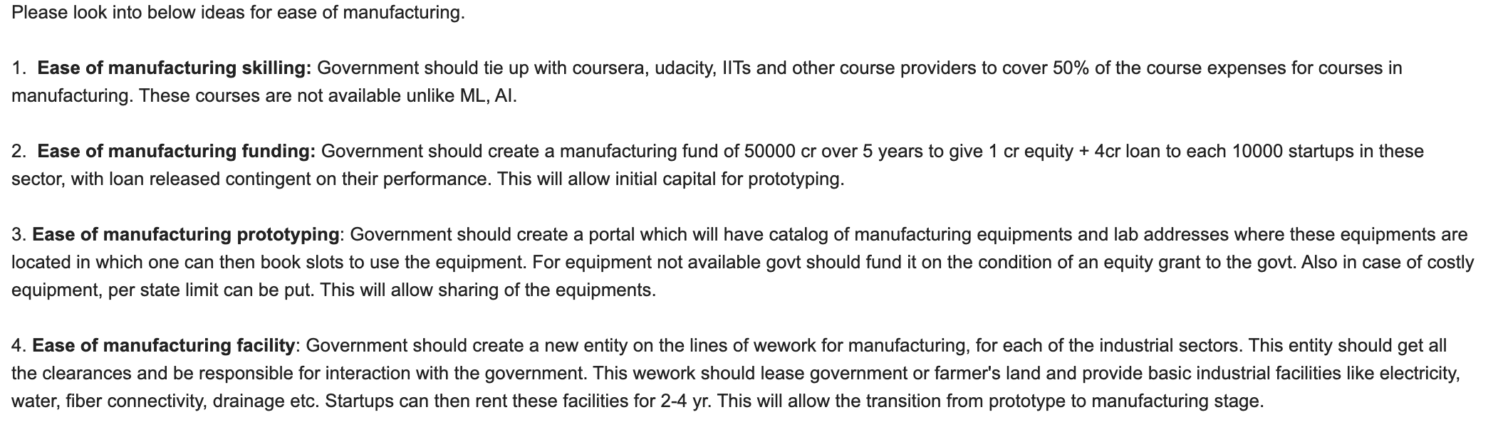 Ease of Manufacturing in India. Should cover below topics: