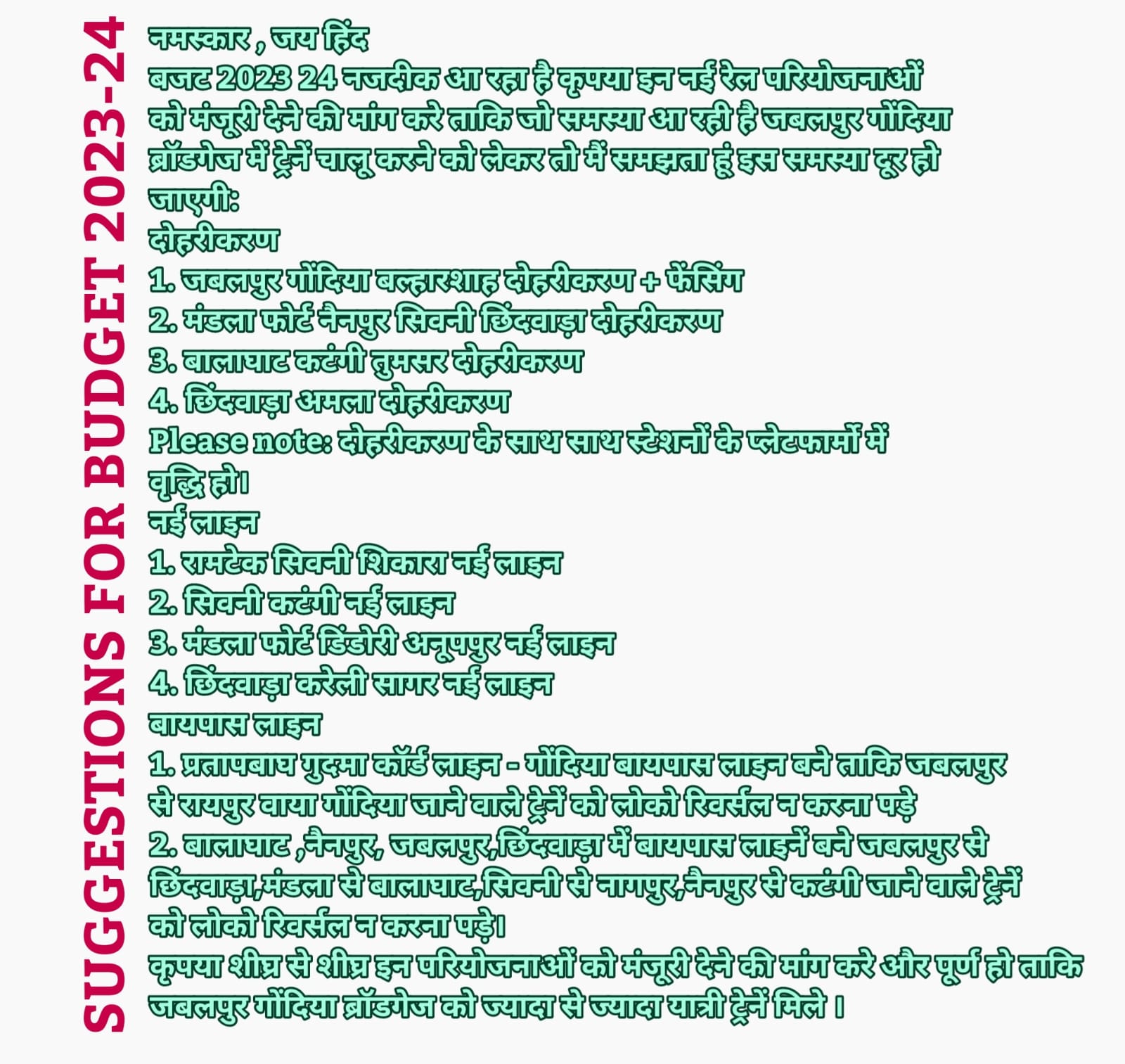 10. बालाघाट ,नैनपुर, जबलपुर,छिंदवाड़ा में बायपास लाइनें बने जबलपुर से छिंदवाड़ा,मंडला से बालाघाट,सिवनी से नागपुर,नैनपुर से कटंगी जाने वाले ट्रेनें को लोको रिवर्सल न करना पड़े।