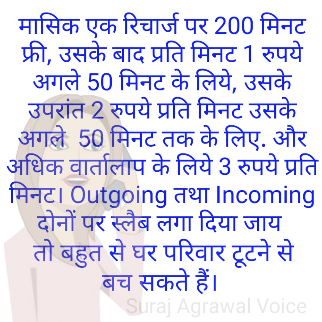मासिक एक रिचार्ज पर 200 मिनट फ्री, उसके बाद प्रति मिनट 1 रुपये अगले 50 मिनट के लिये, उसके उपरांत 2 रुपये प्रति मिनट उसके अगले 50 मिनट तक के लिए. और अधिक वार्तालाप के लिये 3 रुपये प्रति मिनट। Outgoing तथा Incoming दोनों पर स्लैब लगा दिया जाय तो बहुत से घर परिवार टूटने से बच सकते हैं।