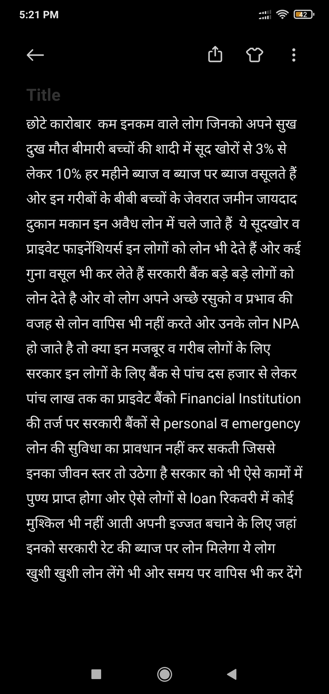 महोदय हम आपकी दया दृष्टि इस तथ्य की ओर आकर्षित कराना चाहते हैं समाज में छोटी छोटी कॉलोनियों में रहने वाले छोटे छोटे कारोबार करने वाले कम इनकम वाले लोग जिनको अपने सुख दुख मौत बीमारी बच्चों की शादी में जो स्थानीय सूद खोरों से जो कि 3% से लेकर 10% हर महीने ब्याज व ब्याज पर ब्याज वसूलते हैं ओर इन गरीबों के बीबी बच्चों के जेवरात जमीन जायदाद दुकान मकान इन अवैध लोन में चले जाते हैं महोदय स्थानीय सूदखोर व प्राइवेट फाइनेंशियर्स इन लोगों को लोन भी देते हैं ओर कई गुना वसूल भी कर लेते हैं