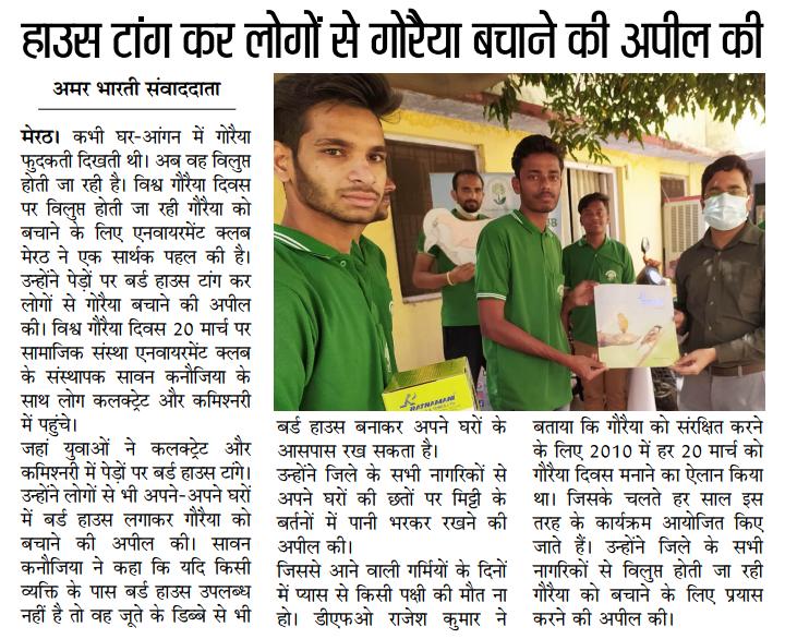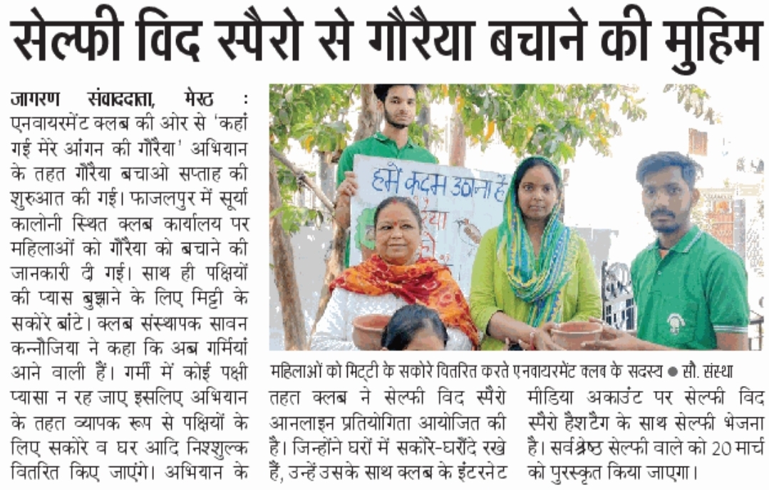 मैं मेरठ उ• प्र• का पत्रकारिता का छात्र हूं। मैंने अपनी नवीं कक्षा में अपने स्कूली मित्रों के साथ मिलकर 'एनवायरमेंट क्लब' नाम का ग्रुप बनाया था जिसमें हम सभी अपनी पॉकेट मनी बचाकर उससे पर्यावरण संरक्षण हेतु कार्य कर रहे हैं। आपकी मन की बात से प्रेरित होकर हम पिछले कई वर्षों से अपनी पॉकेट मनी से मिट्टी के सकोरे व लकड़ी के घर वितरित करते हैं। 'कहां गई मेरे आंगन की गौरैया' अभियान चलाकर हमने सकोरे व घर बांटे। आपसे सादर अनुरोध कि एक बार पुनः सभी को पक्षियों के संरक्षण हेतु अपील करें।