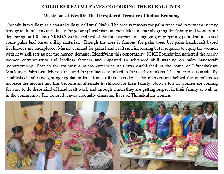 Herewith sharing a sucess story of Palm leaf handcrafts making unit 'Panaikakuam Mankaiyar ' women's group at Thinaikulam village ,Ramnad district,Tamil Nadu by ICICI Foundation
