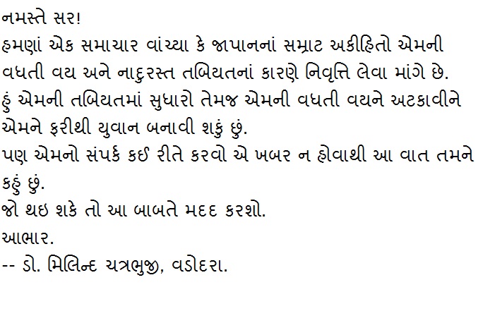 હમણાં એક સમાચાર વાંચ્યા કે જાપાનનાં સમ્રાટ અકીહિતો એમની વધતી વય અને નાદુરસ્ત તબિયતનાં કારણે નિવૃત્તિ લેવા માંગે છે.