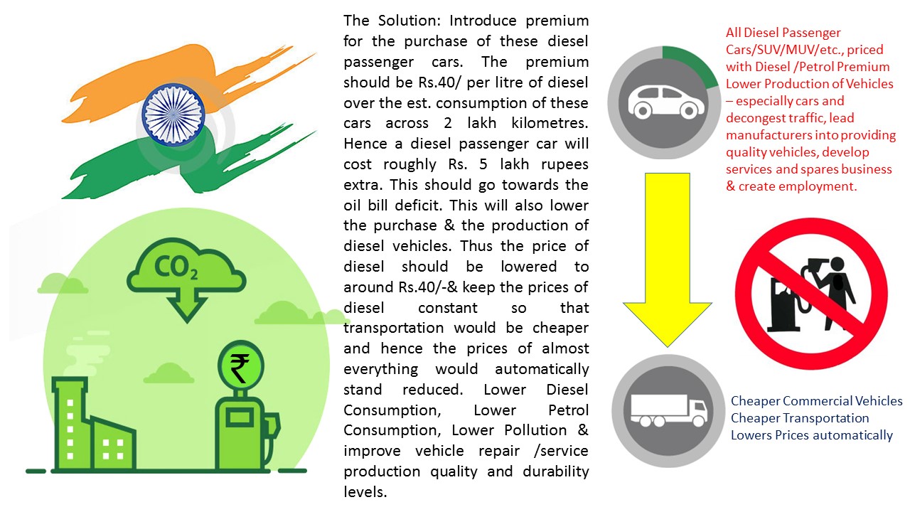 Plan to lower the consumption & stabilize the price of Diesel. Encourage responsible consumption, lower production of diesel cars, suvs, muvs etc., increase vehicle service & spare parts business. Lower pollution, bridge Oil bill deficit - and finally lower prices & arrest price increase. download the jpg file for a working plan.