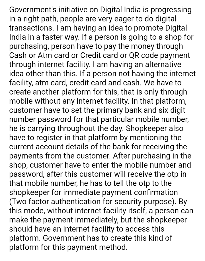 Respected PM Modi sir and Ministry of Youth Affairs and Sports, I wish to share my SIX IDEAS with you. Please find the attached Five Images for your consideration. PM Modi Sir and Youth Ministry, I am eagerly waiting for your reply and I wish to meet you, to share more ideas for the Development of our Nation - Sethuraman L (Age: 27), Madurai, Tamil Nadu