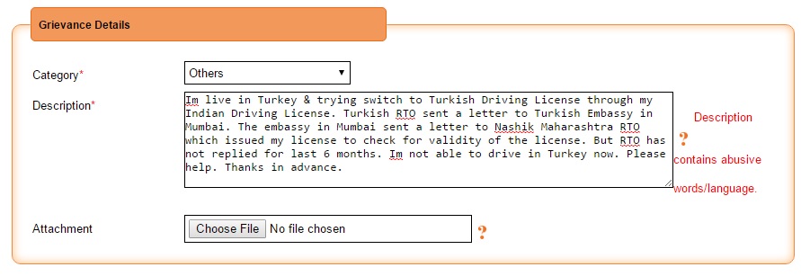 MADAD system keeps giving error "Description contains abusive language". See same message below, which part of it is abusive?!!