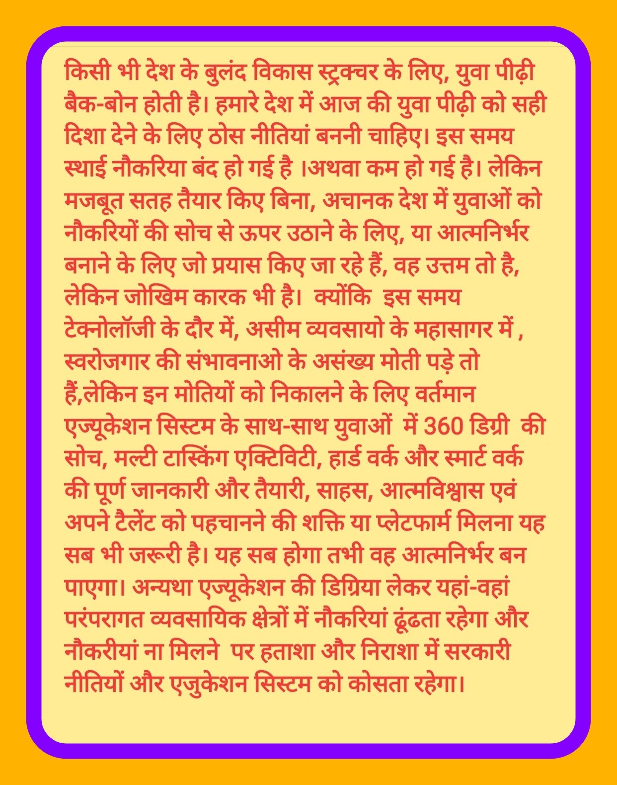 I want to express my openion in this regards, in my views it's big demand and primarily need of youths of India is unemployment.