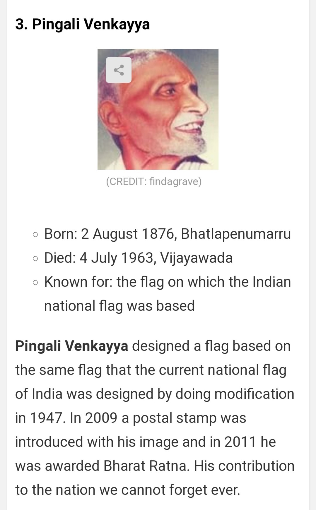Sri Pingali Venkayya who is designer of our National Flag. I am proud to say that , he is form Andra Pradesh. I am attaching details and we all has to remembered him In every time when saw our Flag.