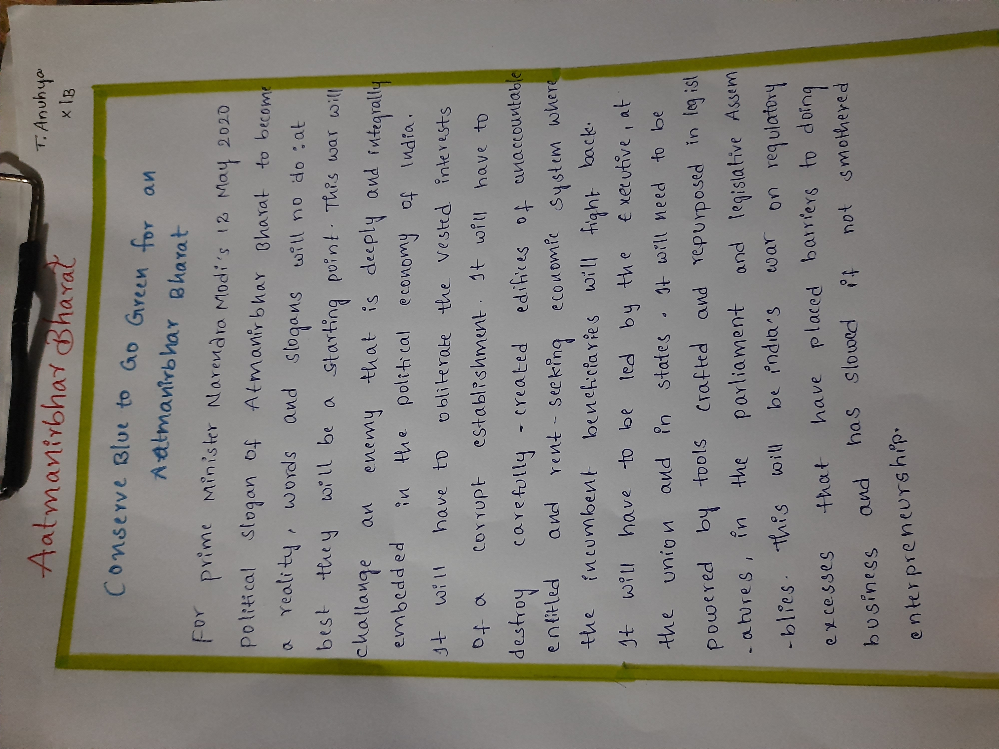 Topic: Essay writing on Conserve Blue To Go Green Atmanirbhar Bharat