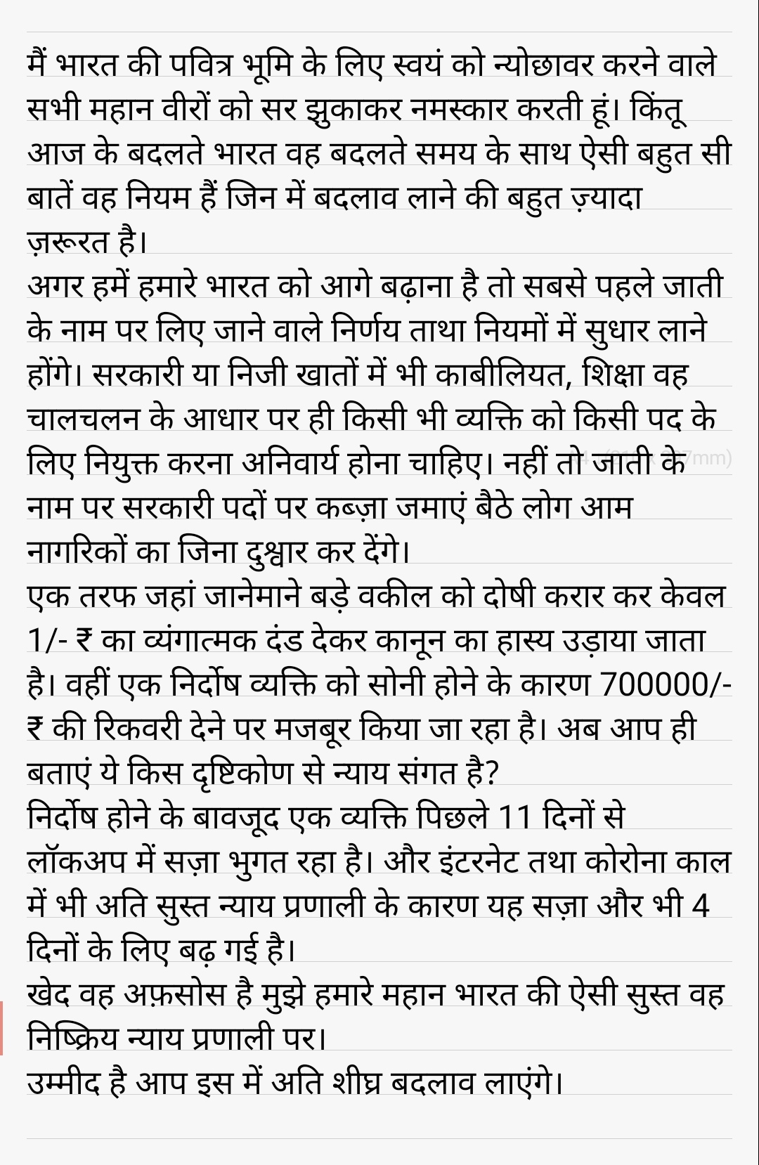 मैं भारत की पवित्र भूमि के लिए स्वयं को न्योछावर करने वाले सभी महान वीरों को सर झुकाकर नमस्कार करती हूं। किंतू आज के बदलते भारत वह बदलते समय के साथ ऐसी बहुत सी बातें वह नियम हैं जिन में बदलाव लाने की बहुत ज़्यादा ज़रूरत है। ...