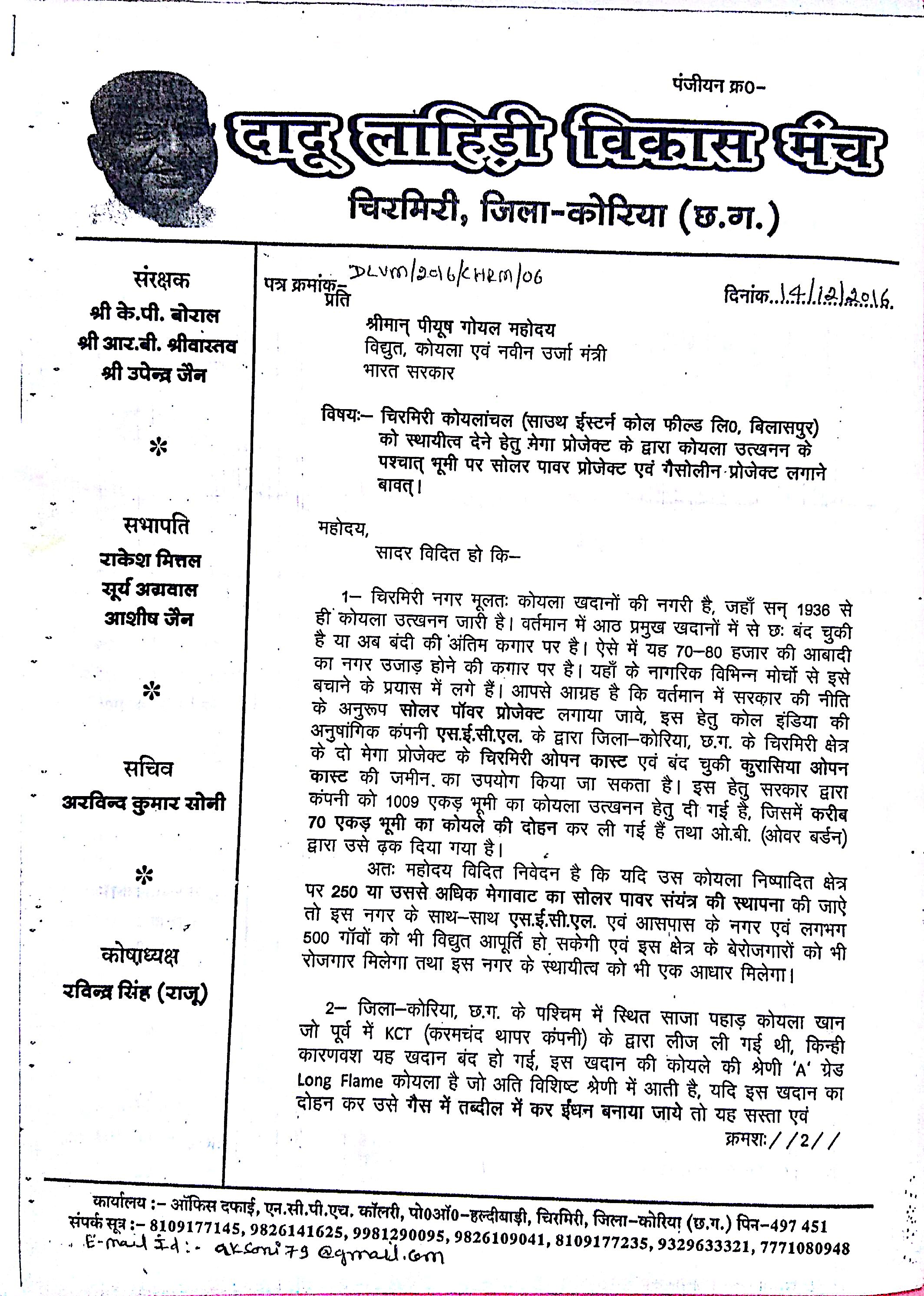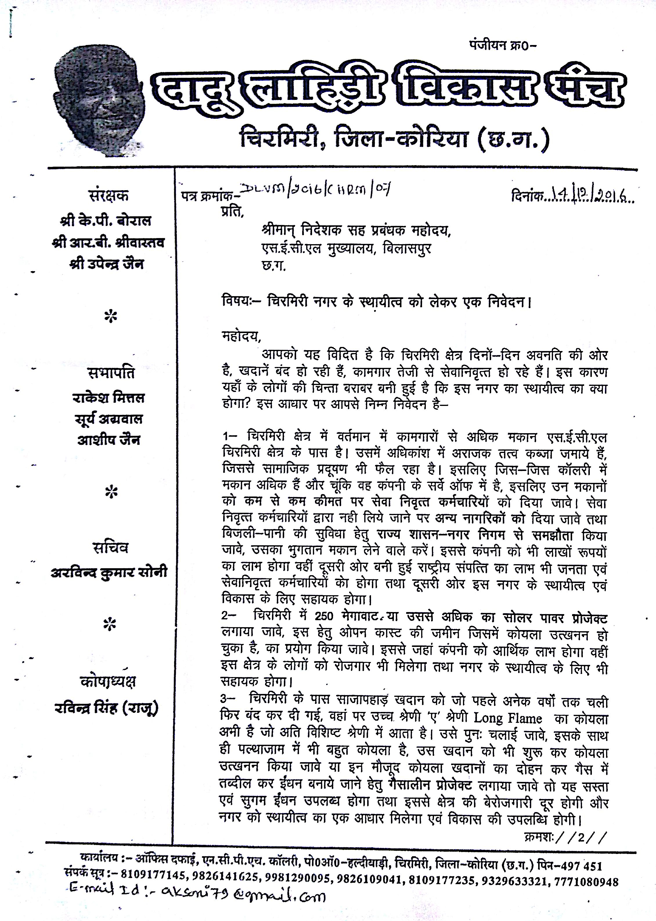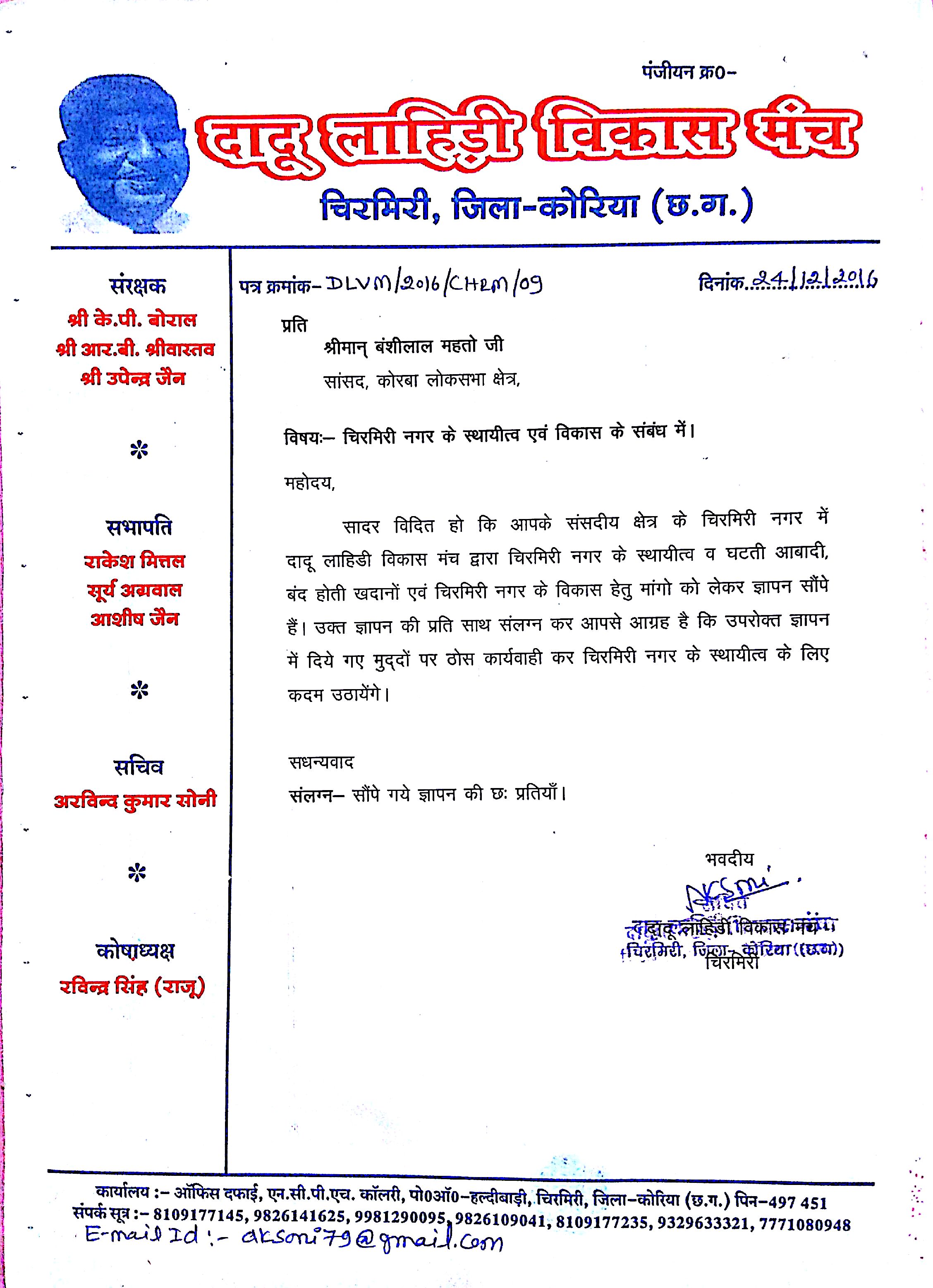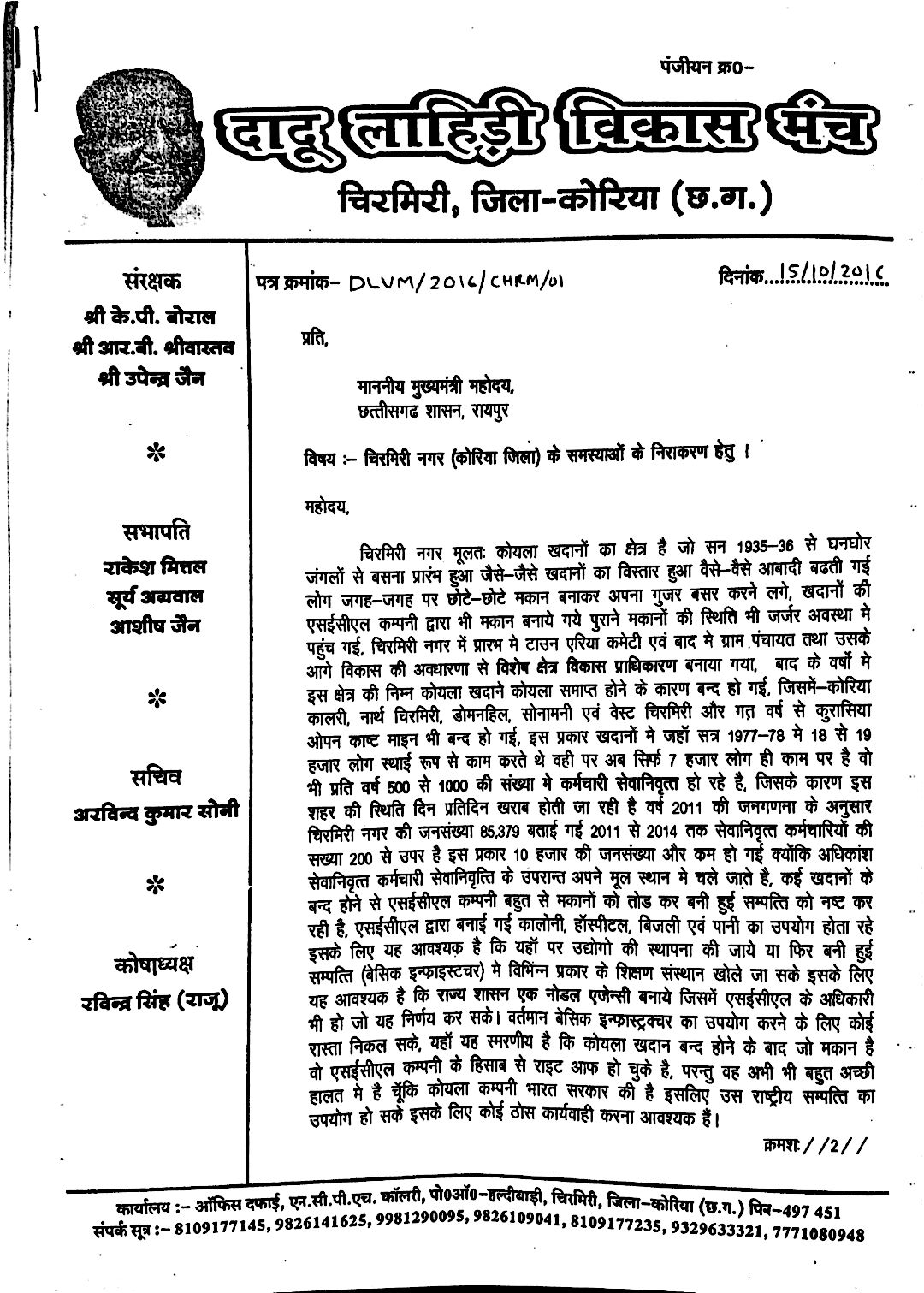 आपसे विन्रम निवेदन है कि संलग्न छग शासन के मुखिया माननीय मुख्यमंत्री महोदय,केंद्रीय मंत्री पीयूष गोयलजी,क्षेत्र के जनप्रतिनिधी सांसद,विधायक, महापौर,जिलाधिकारी को दिए पत्र ज्ञापन पर कृपया संज्ञान लेकर कोयला नगरी जोकी नगर निगम भी है,इसके अस्तित्व की रक्षा करें,स्थायित्व दिलायें और सबसे महत्वपूर्ण आपकी मंशा और आपके सरकार की निति अनुसार चिरिमिरी का विकास करके नयी पहचान दिलायें। चिरिमिरी की जनता किसी की भी सरकार रही हो, हमेशा ही उपेक्षित रही,भेदभावपूर्ण रवैया रहा।