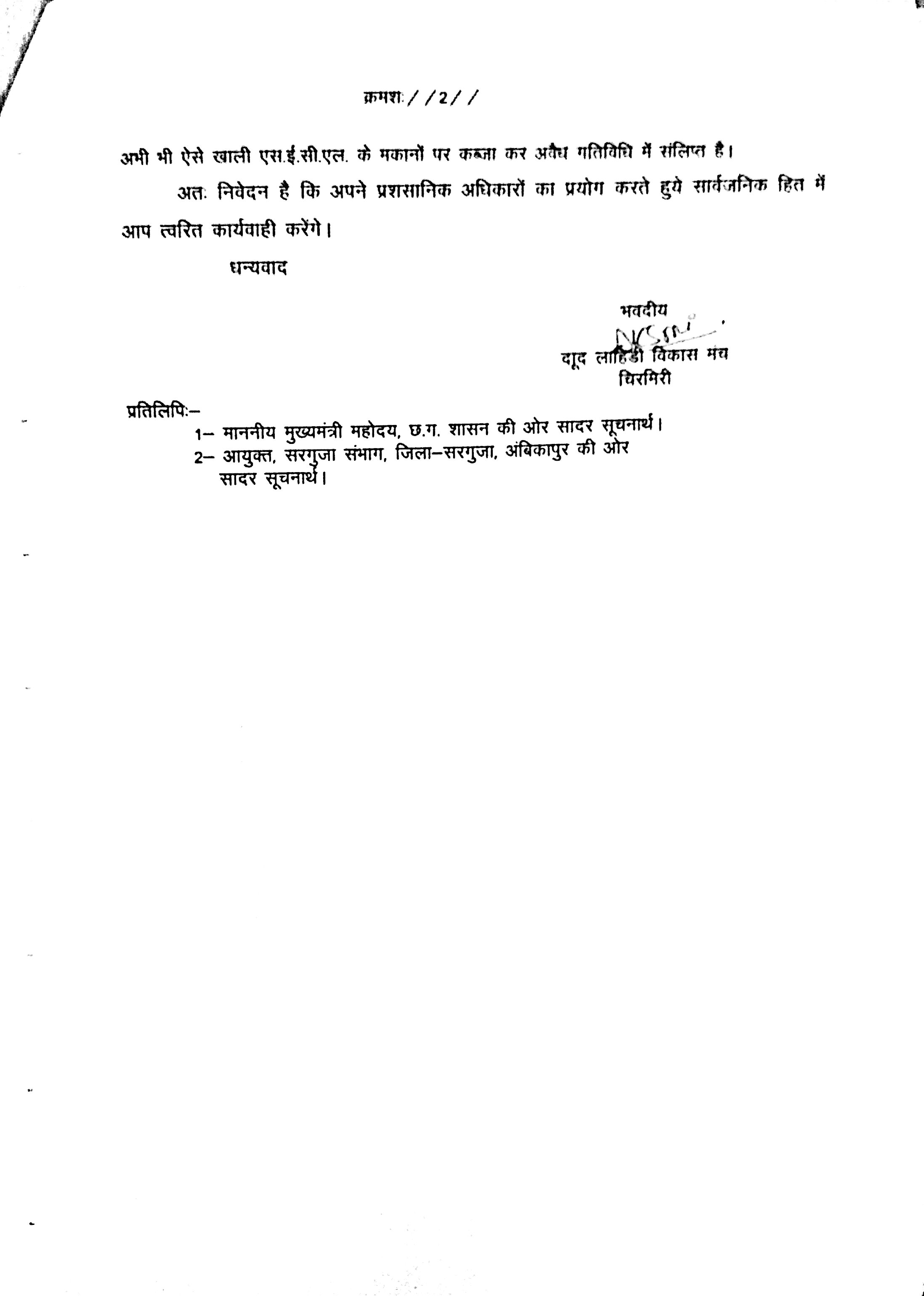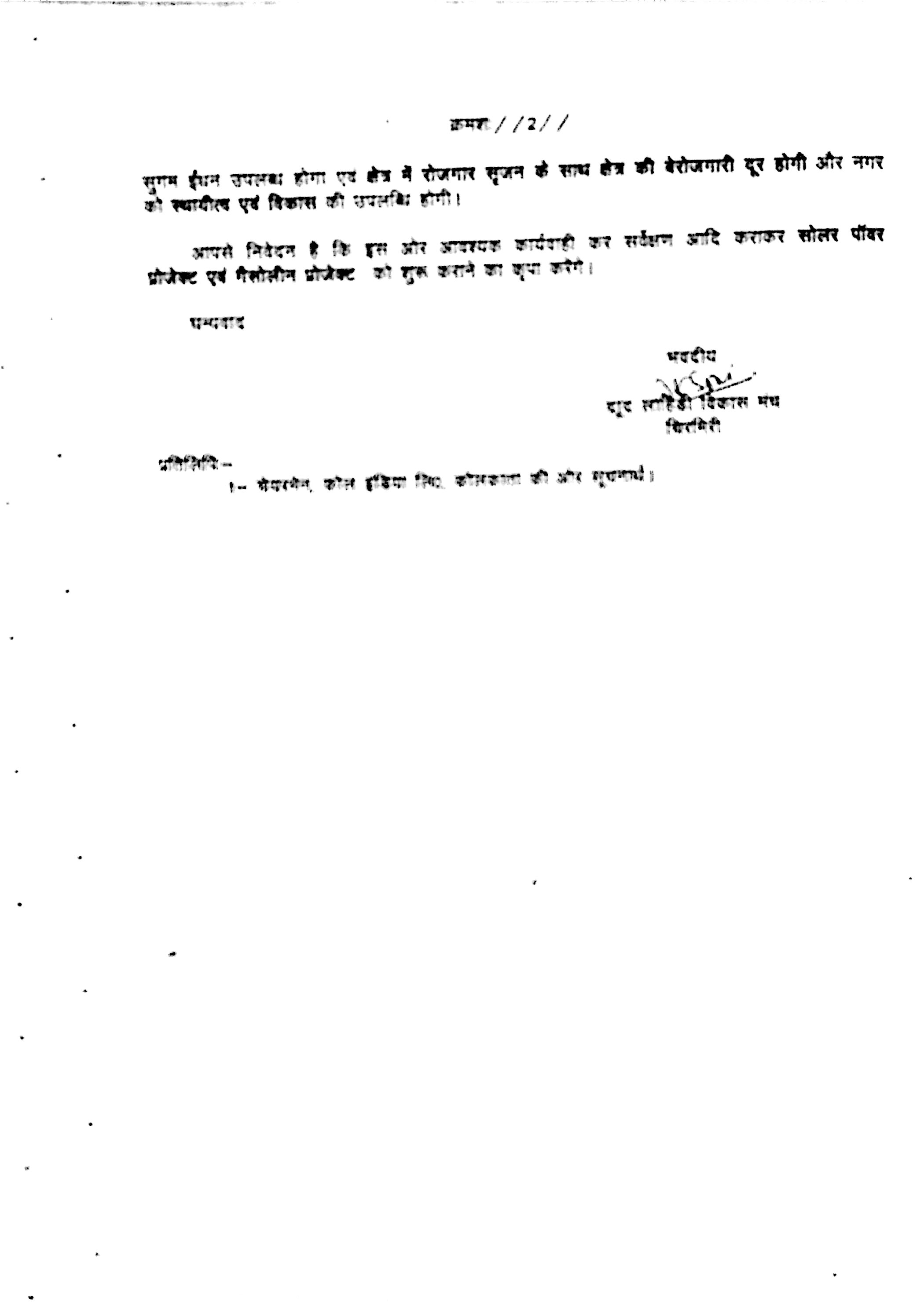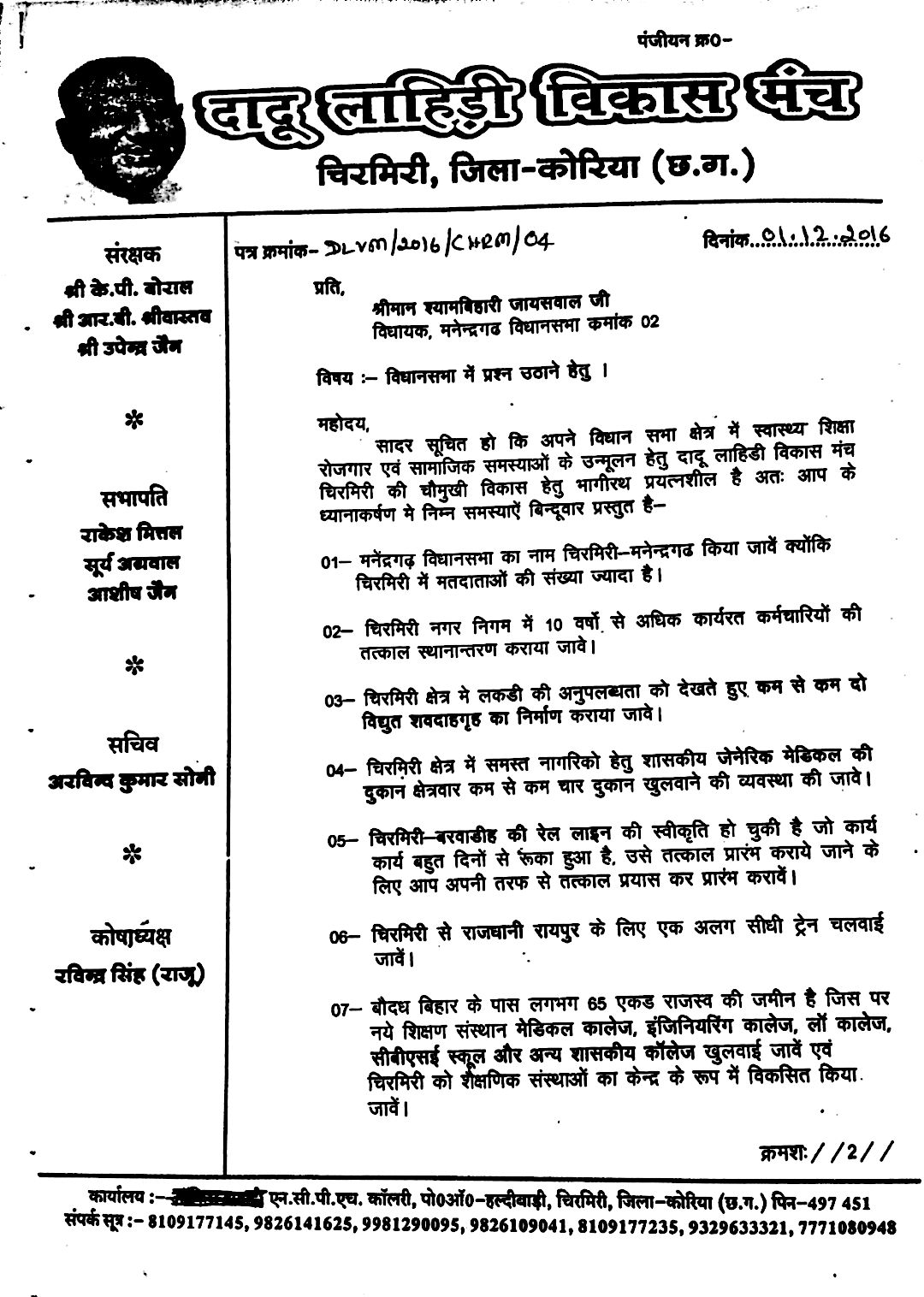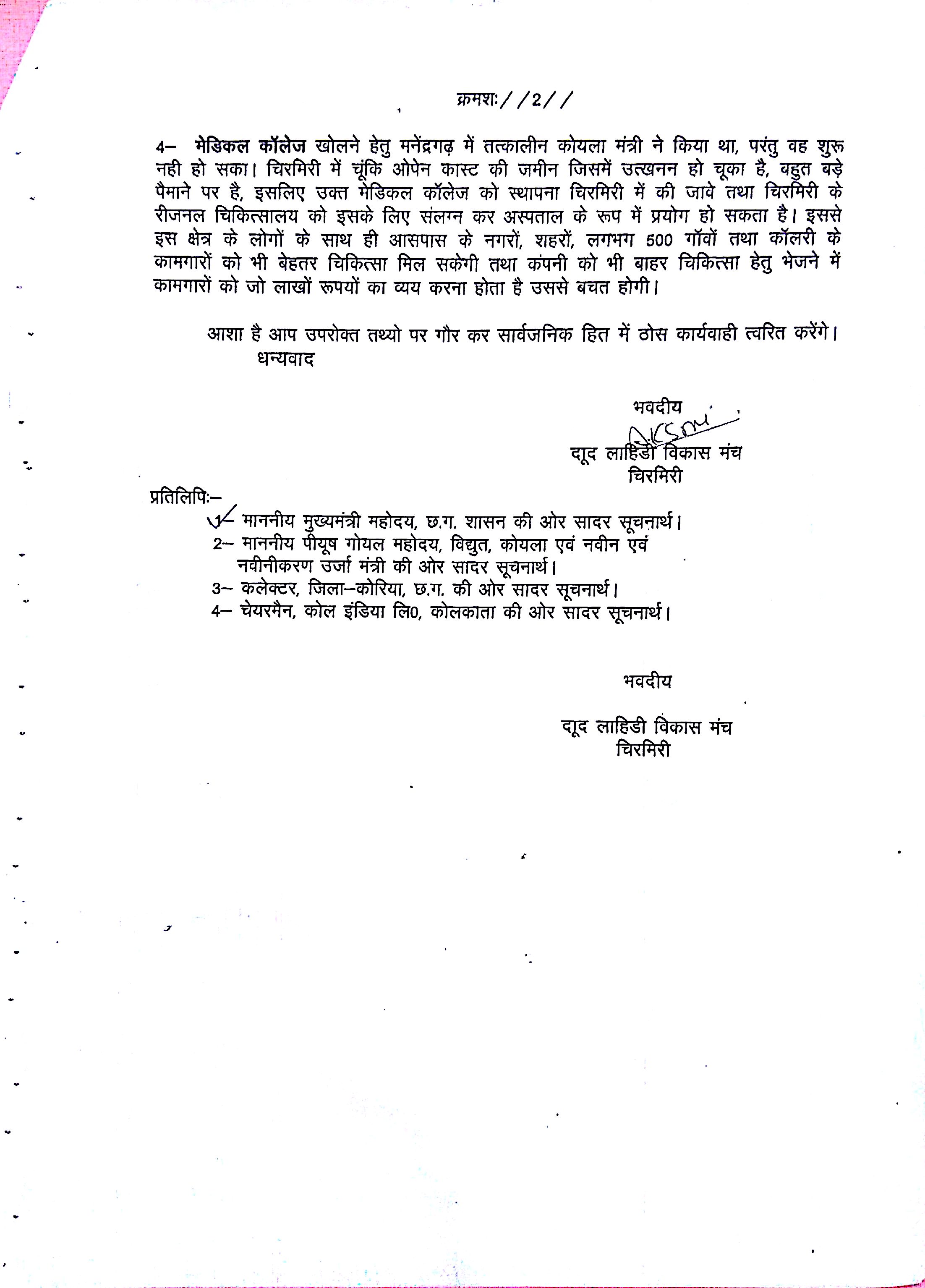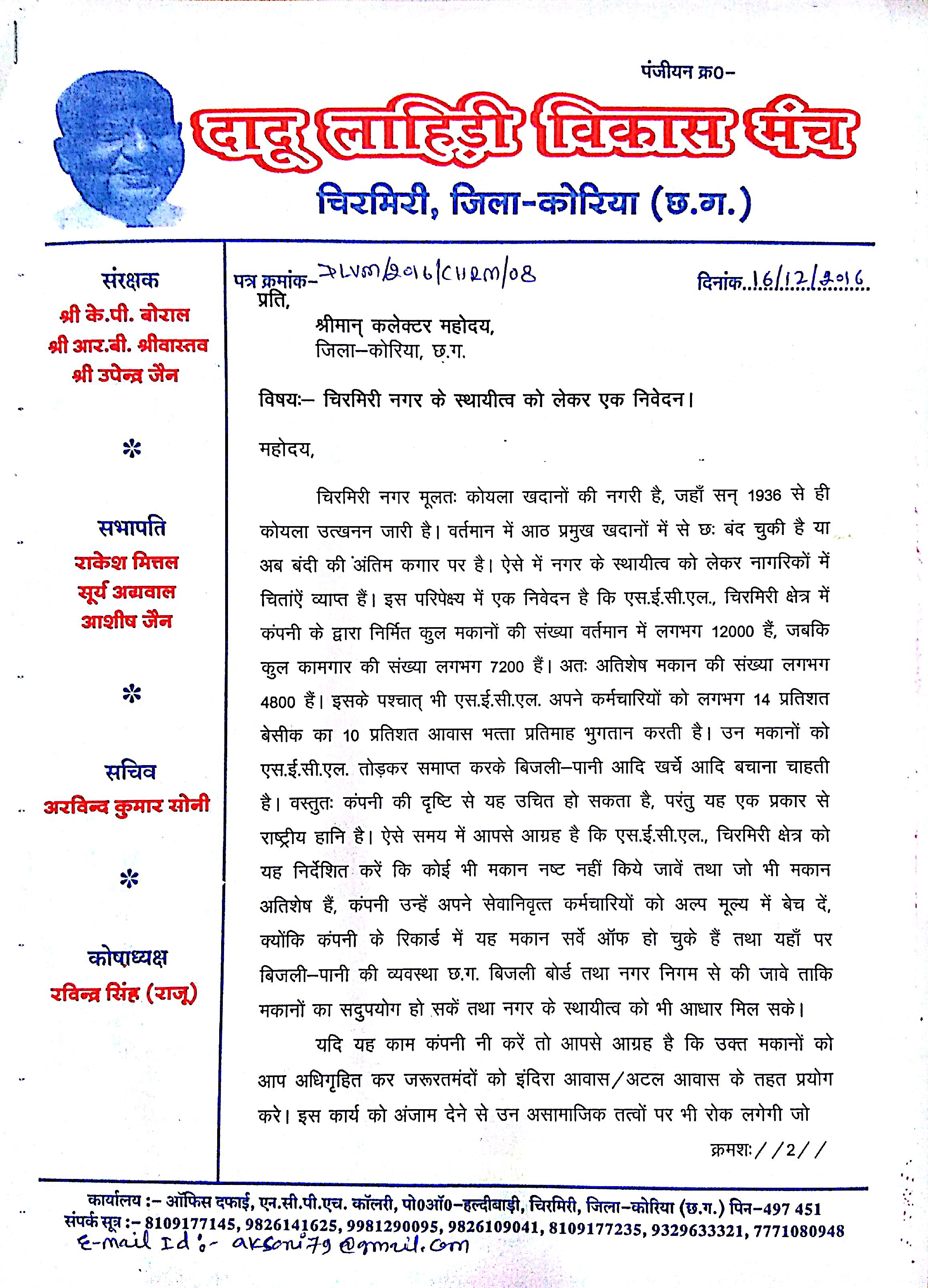 आपसे विन्रम निवेदन है कि संलग्न छग शासन के मुखिया माननीय मुख्यमंत्री महोदय,केंद्रीय मंत्री पीयूष गोयलजी,क्षेत्र के जनप्रतिनिधी सांसद,विधायक, महापौर,जिलाधिकारी को दिए पत्र ज्ञापन पर कृपया संज्ञान लेकर कोयला नगरी जोकी नगर निगम भी है,इसके अस्तित्व की रक्षा करें,स्थायित्व दिलायें और सबसे महत्वपूर्ण आपकी मंशा और आपके सरकार की निति अनुसार चिरिमिरी का विकास करके नयी पहचान दिलायें। चिरिमिरी की जनता किसी की भी सरकार रही हो, हमेशा ही उपेक्षित रही,भेदभावपूर्ण रवैया रहा।