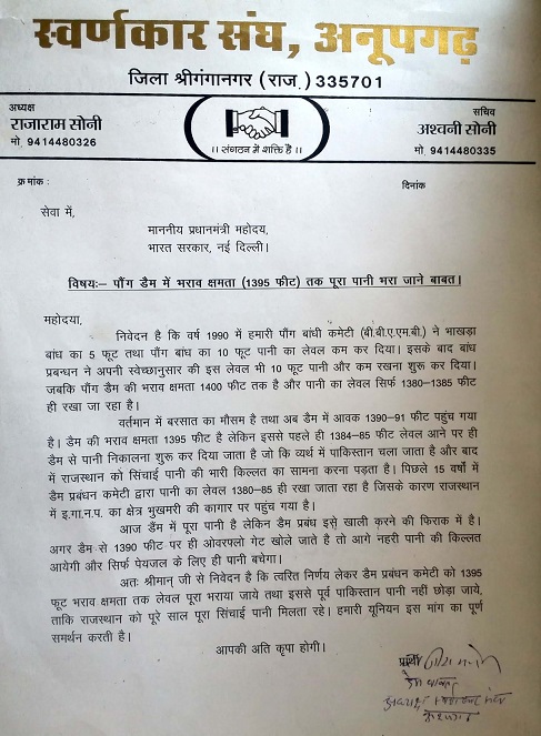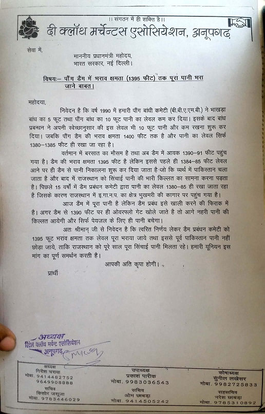 Please fully fill the Pong Dam @ Level 1400 Feet. The Grain Merchant Association Anupgarh (Distt. Rajasthan) Letters is attached. All other Unions and Organsation is also demading for it.