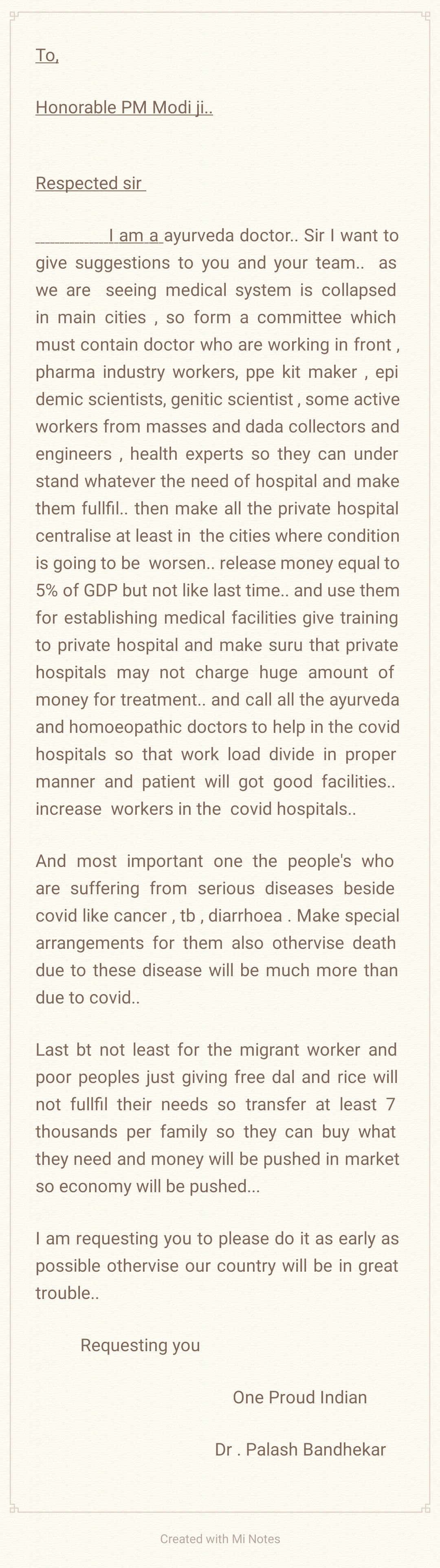 Sir I am ayurveda doctor.. and I want to give suggestions to you and your team so we can fight with covid properly and manage the situation of country as well I am sending a letter to honourable PM Modi ji..
