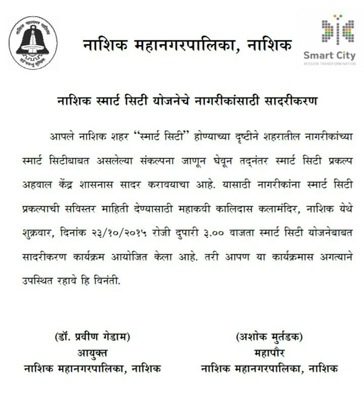 Nashik Municipal Corporation is organizing a seminar to create awareness among citizens regarding smart city mission. Event is organized at Kalidas Auditorium at 3.00 pm on 23rd August 2015. Please attend the event.