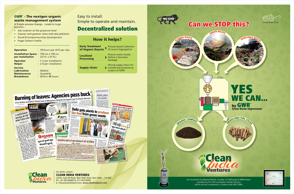 A city is not smart until it manages its waste well. Waste management process should be decentralised and locality based, quick and real time. It is surprising to note that 70% of waste is organic in nature & can be reprocessed before it becomes waste or, thereafter, can be recycled in a sustainable manner. We have invented a Green Waste Reprocessor machine which re‐process all green reject and converts it into valuable by‐products. More details can be found on www.cleanindiatech.com #MyGov