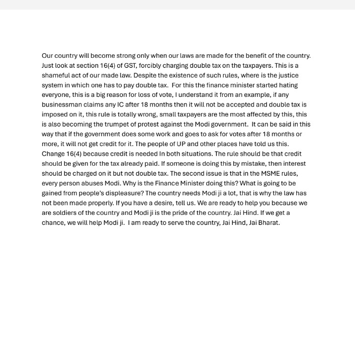 Our country will become strong only when our laws are made for the benefit of the country. Just look at section 16(4) of GST, forcibly charging double tax on the taxpayers. This is a shameful act of our made law. Despite the existence of such rules, where is the justice system in which one has to pay double tax. For this the finance minister started hating everyone, this is a big reason for loss of vote, I understand it from an example, if any businessman claims any IC after 18 months then it will not be accepted and double tax is imposed on it, this rule is totally wrong, small taxpayers are the most affected by this, this is also becoming the trumpet of protest against the Modi government. It can be said in this way that if the government does some work and goes to ask for votes after 18 months or more, it will not get credit for it. The people of UP and other places have told us this. Change 16(4) because credit is needed in both situations. to be continue in pdf