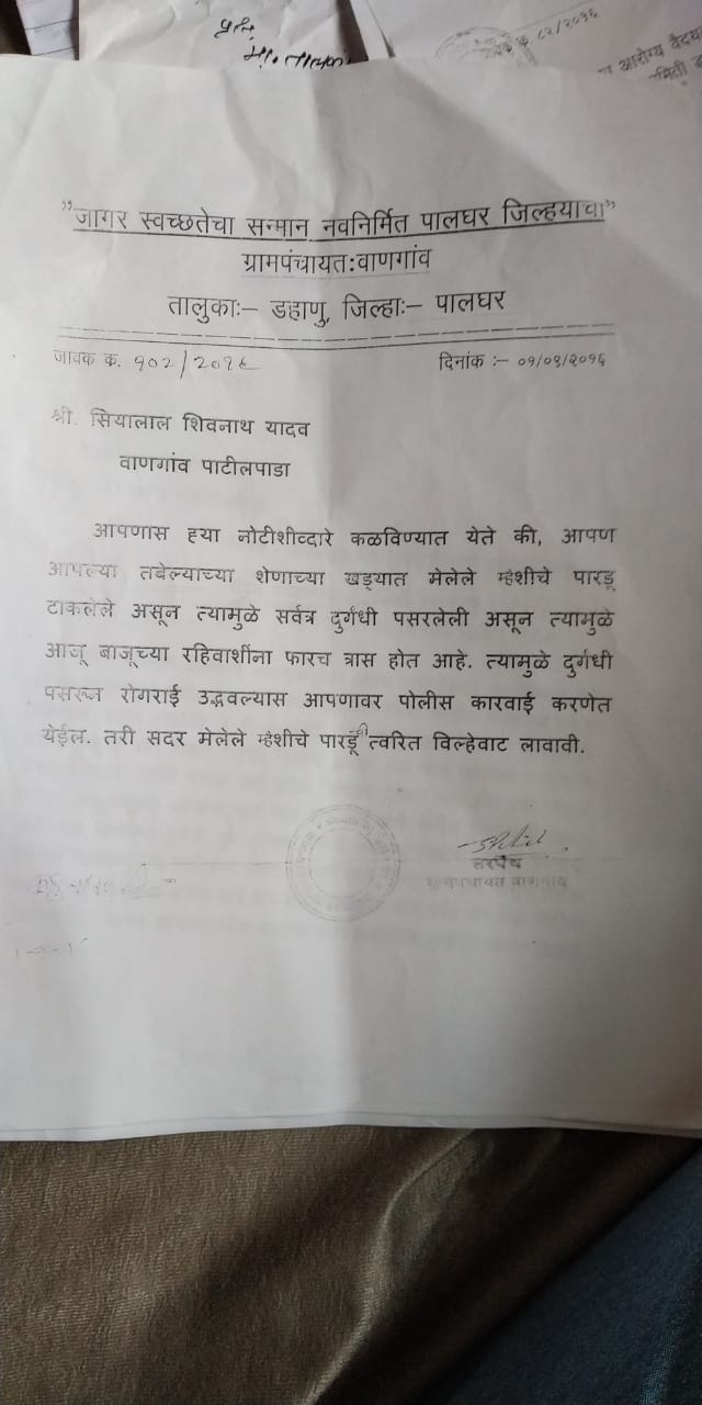 Respected Sir, I am pleased to have been born in a Generation where You are Our Prime Minister. Your Efforts on Cleanliness is Super. But, the Local Authorities are damaging your Reputation. In our Locality, Siyalal Shivnath Yadav, living at Vangaon Patilpada has Blocked the Public Drainage and causing Public Nuisance through Cowdungs and Urinals from his Cow stable. The health officer had surveyed reported to the Vangaon Gram Panchayat, Taluka: Dahanu, Dist. Palghar, 401103 but no action taken.