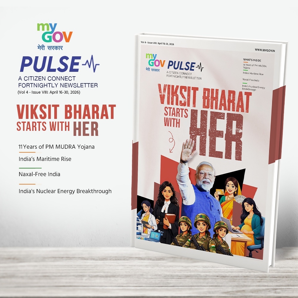 Explore the latest edition of MyGov Pulse featuring Nari Shakti as the driving force behind Viksit Bharat. This issue also highlights 11 Years of PM MUDRA Yojana, India’s Maritime Rise, Naxal-Free India, and India’s Nuclear Energy Breakthrough.