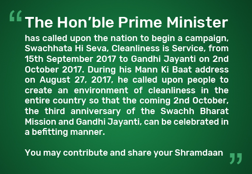 Swachhata Hi Seva Commences on 15th September. : Come Join us. Be a Swachhata Shramik and support in building a cleaner nation as a tribute to Mahatma Gandhi for his birth anniversary on 2nd October.