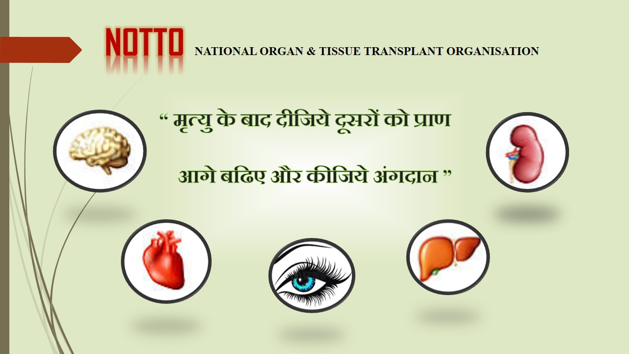 Government of India as a part of its health initiative through the Ministry of Health & Family Welfare has created the National Organ & Tissue Transplant Organisation (NOTTO) to promote Organ Donation and transplantation. There is growing need of organs for transplantation in lakhs of patients suffering from end stage organ failure (kidneys, liver, heart, lung, pancreas, etc.) and also the need of tissues such as skin, bone, cornea and heart valve in patients with tissue loss (extensive burns, comminuted fractures, corneal opacity with blindness and severe valvular heart disease).