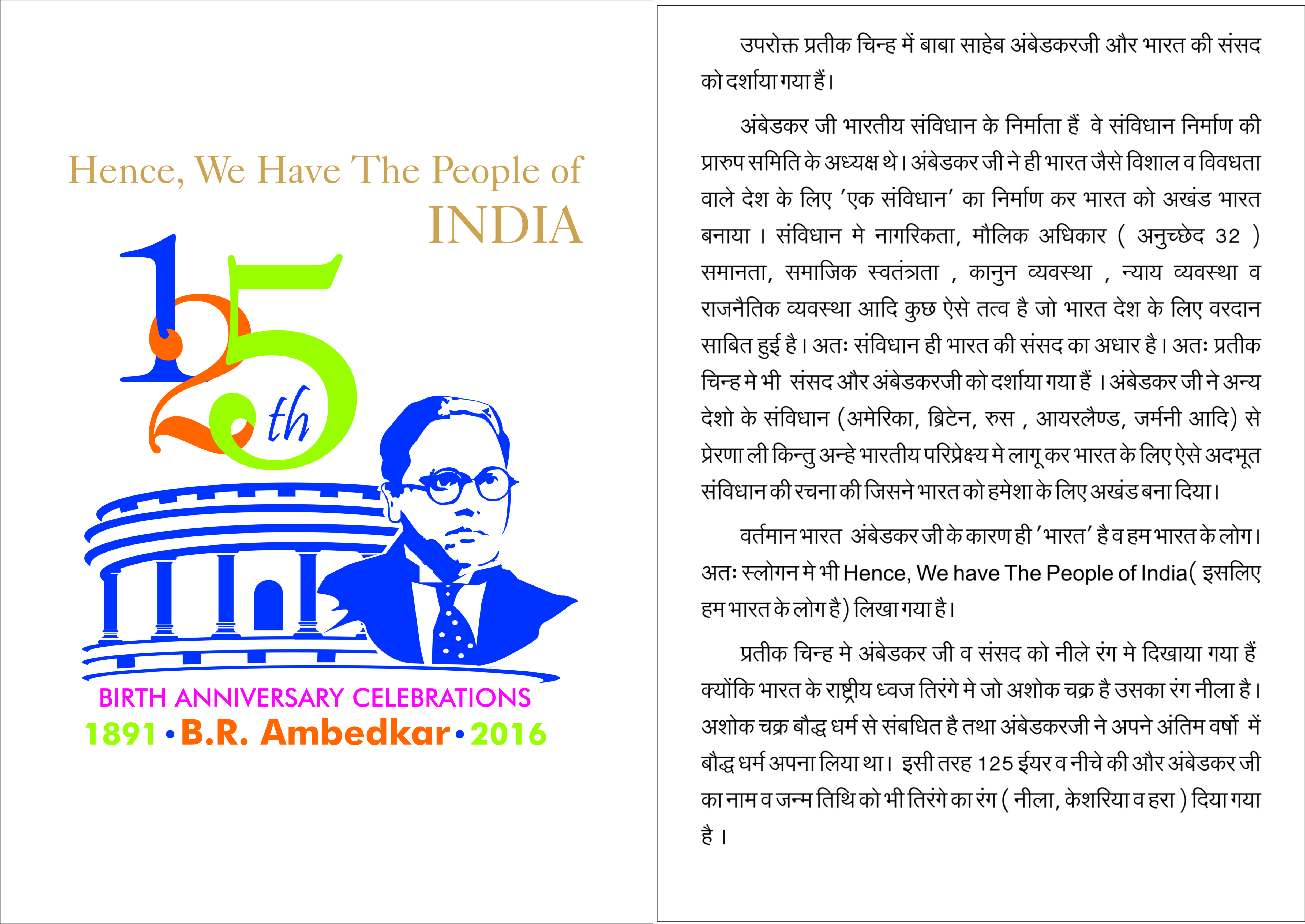 The logo symbolizes the impact of the great contribution of Dr. B. R. Ambedkar to the development of India. The logo shows that the powerful Constitution drafted by Dr. Ambedkar has directed the nation towards 'a revolution of growth and prosperity where India today is making mark in the global scenario!'