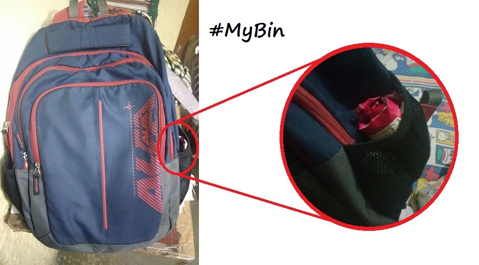This is my mobile bin. Whenever I do not find any dustbin near me which is very common when I am travelling then I collect the waste in the side pocket of my bag and throw it in a dustbin whenever I find one. The funny thing is that most of the time I forget the thrash in my bag and end up throwing the thrash at my home's dustbin and my maa is like 'why you keep on collecting garbage in your bag?'.
