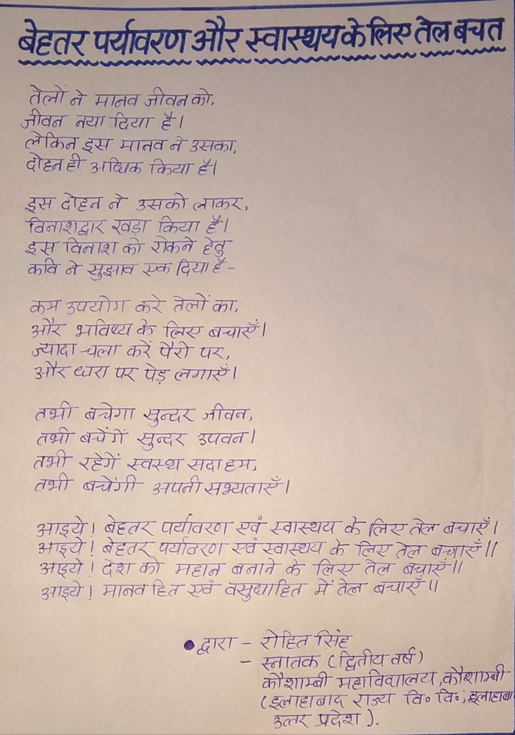 Petroleum Conservation Research Association (PCRA), under the aegis of Ministry of Petroleum & Natural Gas, Govt. of India, is committed to make oil conservation a National Movement. As a part of its mandate, Poem/Song Contest is being conducted.