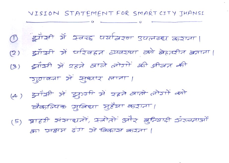 1. A statement outlining the vision for what we would want Jhansi to be as a smart city. It should be a positive statement.